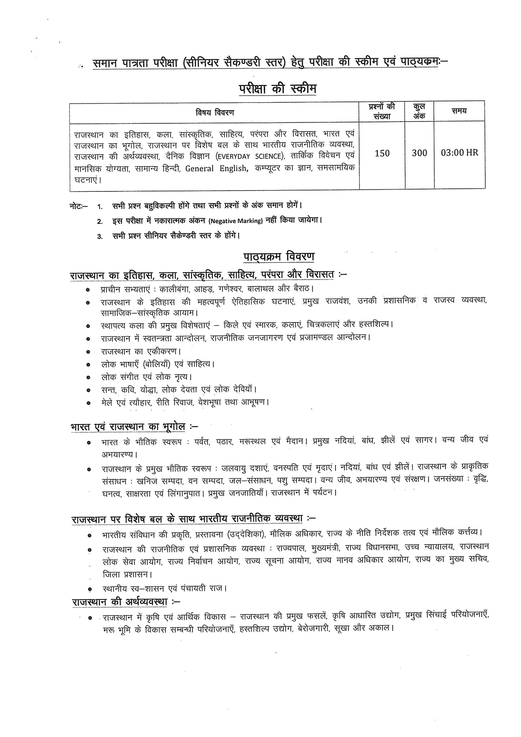 Rajasthan History, Art, Culture, Literature, Tradition & Heritage, Geography of India & Rajasthan, Indian Political System (Special emphasis on Rajasthan), Rajasthan Economy, Everyday Science, Logical Reasoning & Mental Ability, General Hindi, General English, Computer Knowledge, Current Affairs15030003:00 Hours